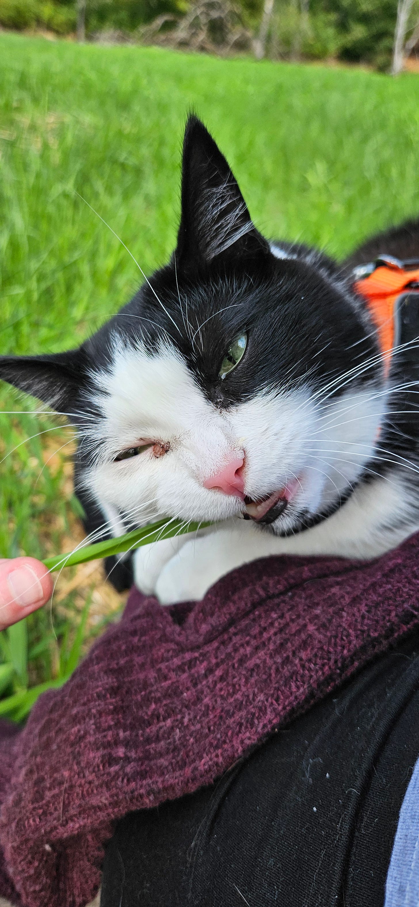 PS: I took myself on a little walk for my mental health today and brought my kitty with me. Here’s a picture of my derpy princess eating some grass to brighten your day.