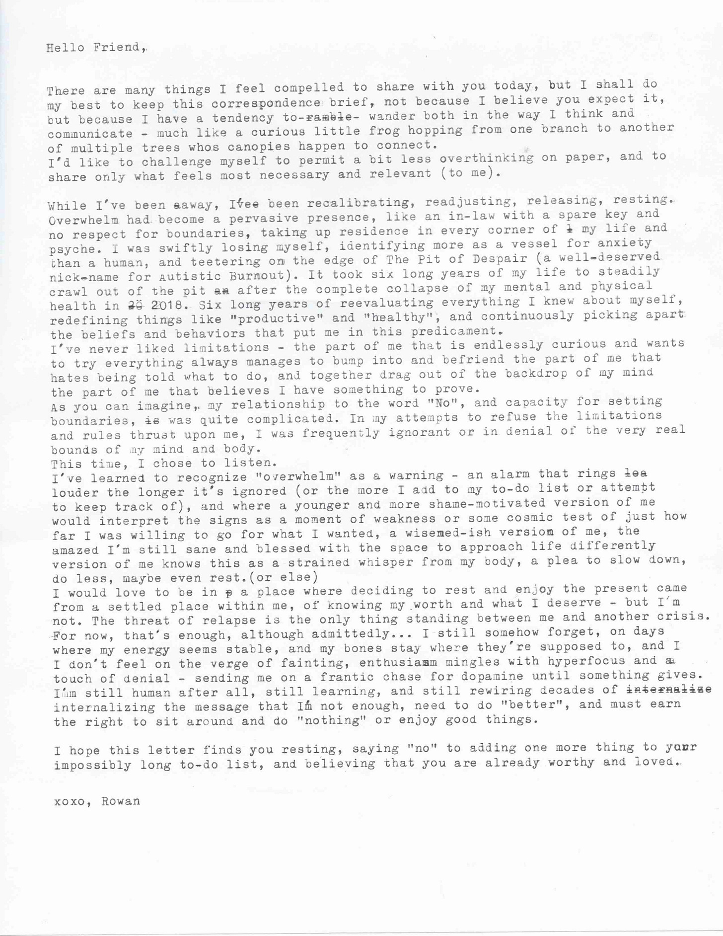 Typing this letter (not just drafting) on my typewriter has inserted some joy to the process, a much needed dose of levity for my demand-avoidant brain (and the heaviness of the things I most want to share).